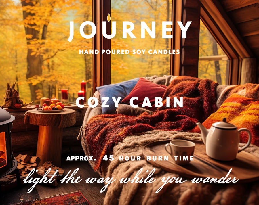 The Journey Candle Cozy Cabin soy candle captures the magic of fall. Like putting on your favorite hoodie, it has a comforting presence for when the leaves start to change combined with that fresh element reminiscent of the chilly air on a fall evening.