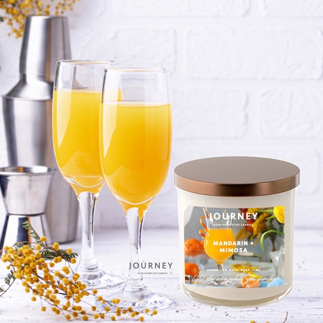 Mandarin + Mimosa is a cheerful citrus fragrance featuring aromas of mandarin orange, champagne, mimosa blossoms, and a touch of coconut.